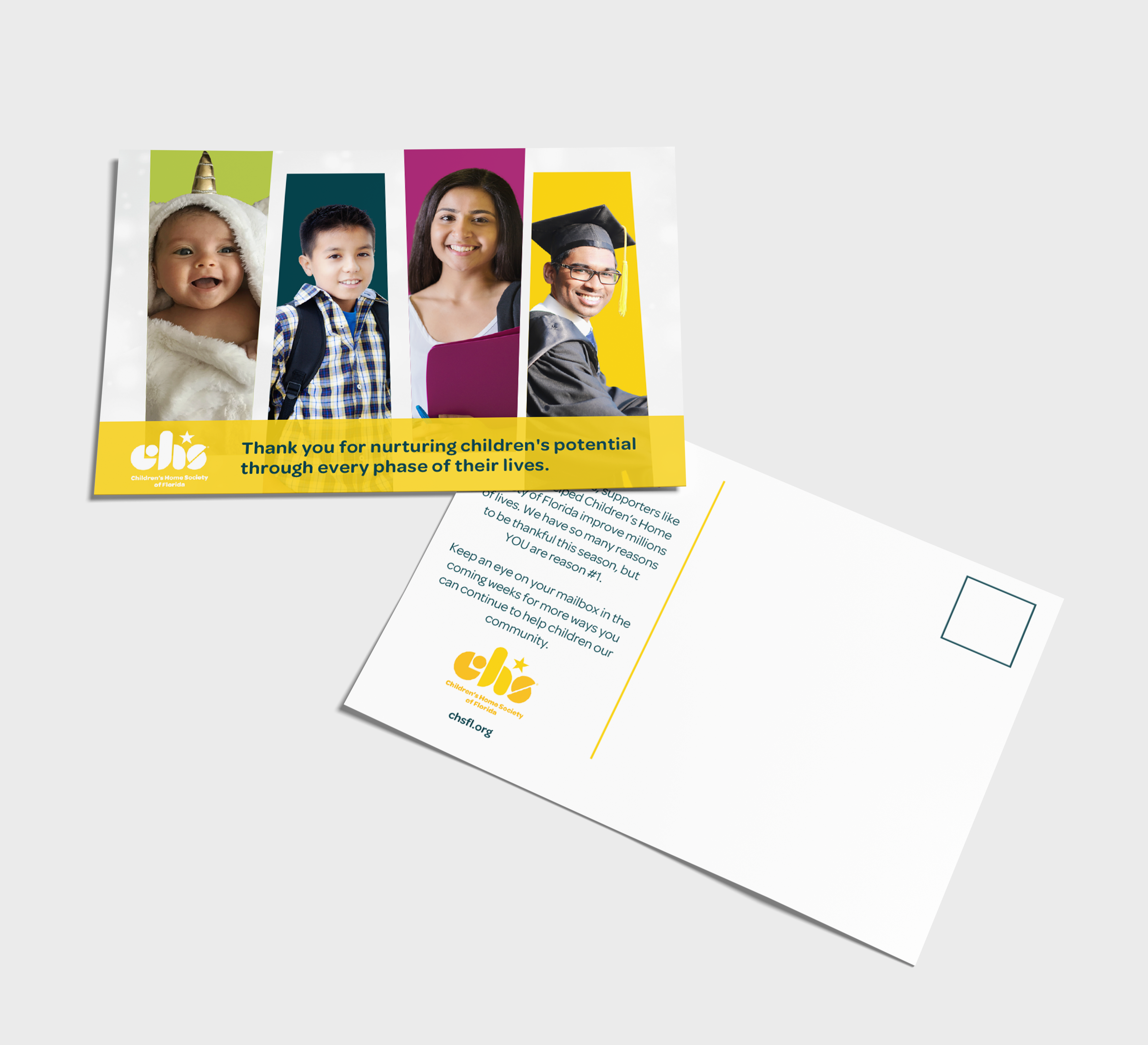 I led the design and messaging for the organization’s end-of-year giving campaign, which encouraged donors to make a lasting impact for children and families before the close of the calendar year. I developed cohesive creative materials across multiple channels—including postcards, a direct mail appeal letter, website headers, and digital and social media graphics—ensuring a consistent visual and narrative identity throughout the campaign.